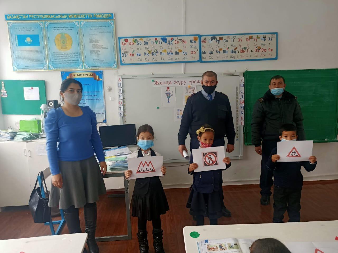 Шу қаласы, Төле би атындағы орта мектебінде жоспарға сай " "Жолда жүру ережелері" тақырыбында бастауыш сынып оқушыларына АПБ-ң инспекторы Нурматов Үміт дәріс өтті.Оқушыларға жол ережелерін үйретіп, таныстырды .
