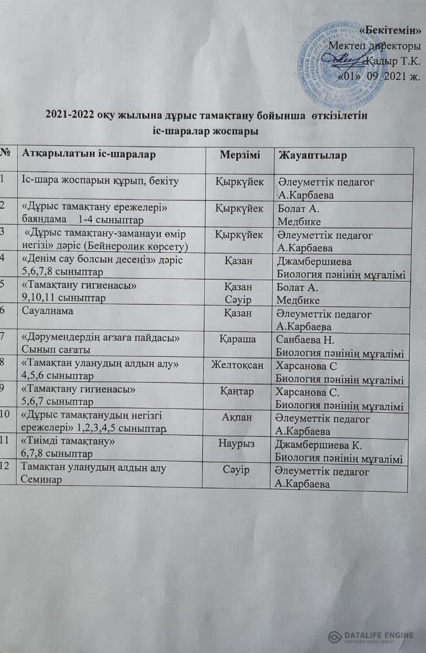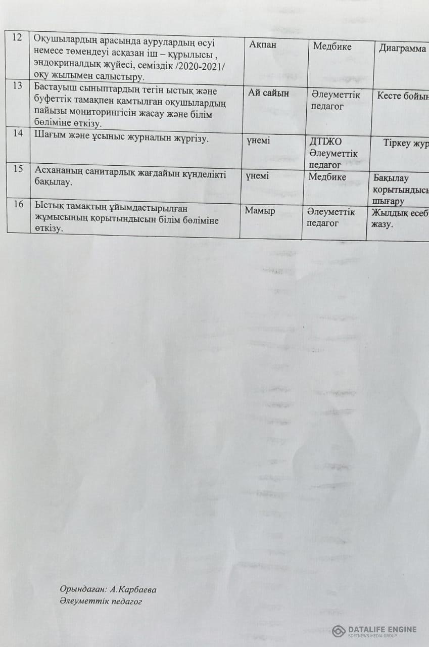 Ыстық тамақтың сапасын бақылау мақсатында құрылған бракераждық комиссия және мониторинг комиссиясының құрамы бекітіліп, жұмыс істеуде. Мектеп асханасында кезекшілік жасалған. Оқушылардың тамақтану кестесі құрылған. Ас мәзірі аудандық білім бөлімінің келісімімен бірге жасалған. Дайын астын күндік сынымысы алынып отырыды.