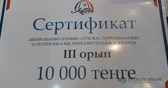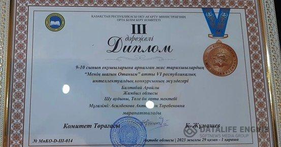 Төле би атындағы орта мектебінің 10 сынып оқушысы Балтабай Арайлы Ақтөбе қаласында өткен 9-10 сынып оқушыларына арналған жас тарихшылардың “Менің шағын Отаным” атты VI республикалық интеллектуалдық конкурсының ІІІ дәрежелі жүлдегері атанды. Сонымен қатар, 10 000 теңгелік сертификатпен марапатталды. Жетекшісі: тарих пәні мұғалімі Асилбекова Ақтолқын Торебековна. Мектебіміздің мақтанышы Арайлыны жеңісімен шын жүректен құттықтаймыз!