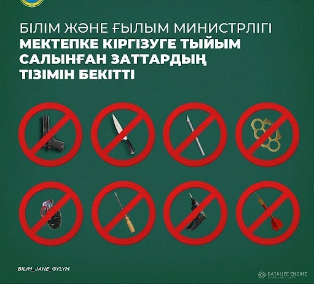 ҚР Білім және ғылым министрінің бұйрығымен мектепке кіргізуге тыйым салынған және пайдалануға болMayтын заттардың тізімі бекітілді. Бұл тізімге қарудың барлық түрі, оқ-дәрілер, жарылғыш заттар, сондай-ақ тесуге және кесуге арналған заттар кіреді.