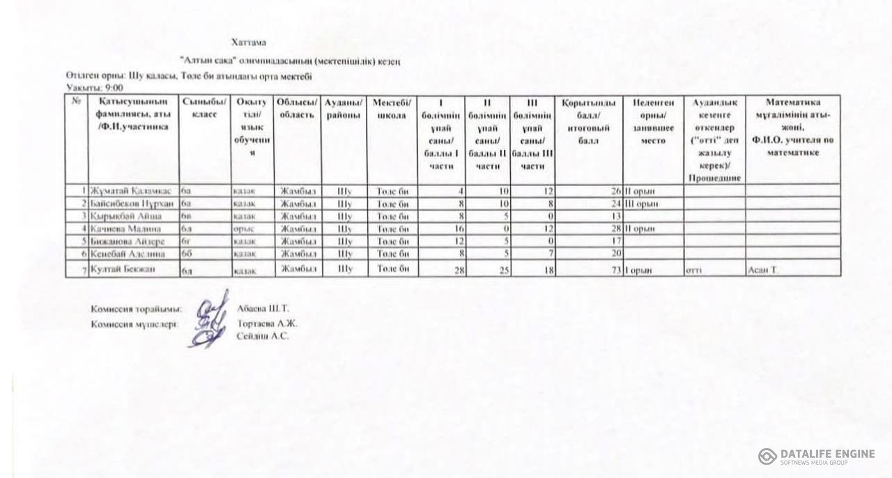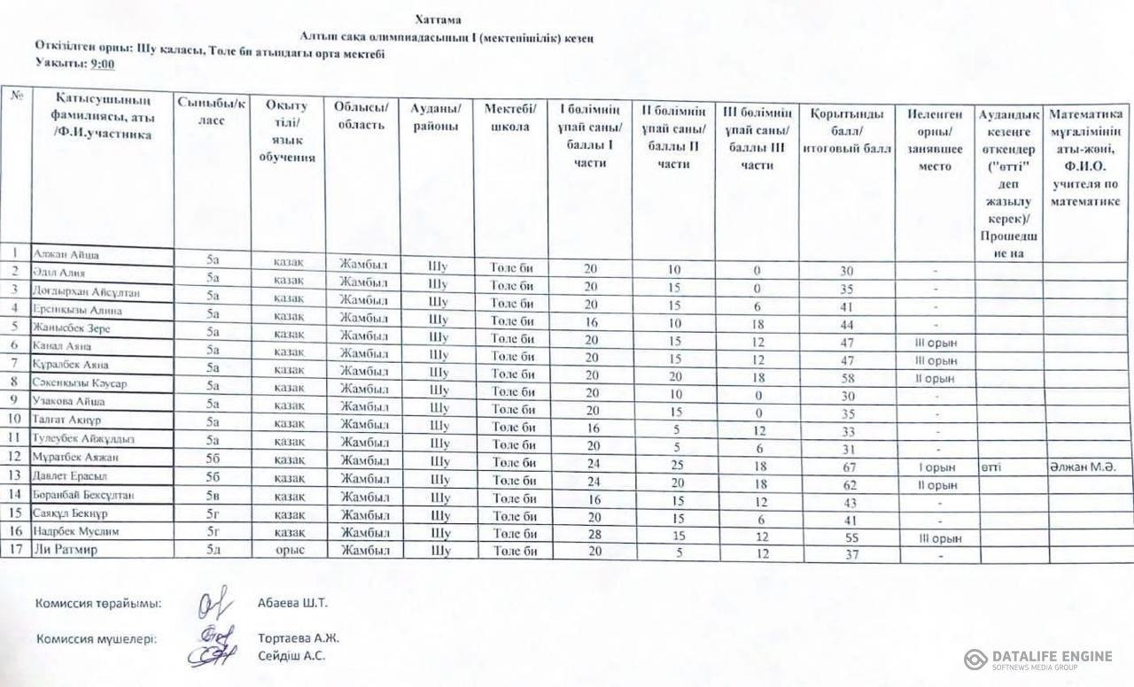 2024.10.01 күні “Дарын” республикалық ғылыми-практикалық орталығы мен “Зерделі” ақыл ой дамыту мектебінің ұйымдастыруымен 5-6 сынып оқушыларына математика пәнінен “Алтын сақа” олимпиадасына мектебімізден тіркелген 24 оқушымыз мектепшілік кезеңіне қатысты. Жеңімпаз оқушыларымыз 5 А сынып оқушысы,Мұратбек Аяжан және 6 Д сынып оқушысы Култай Бекжан аудандық кезеңге өтті.