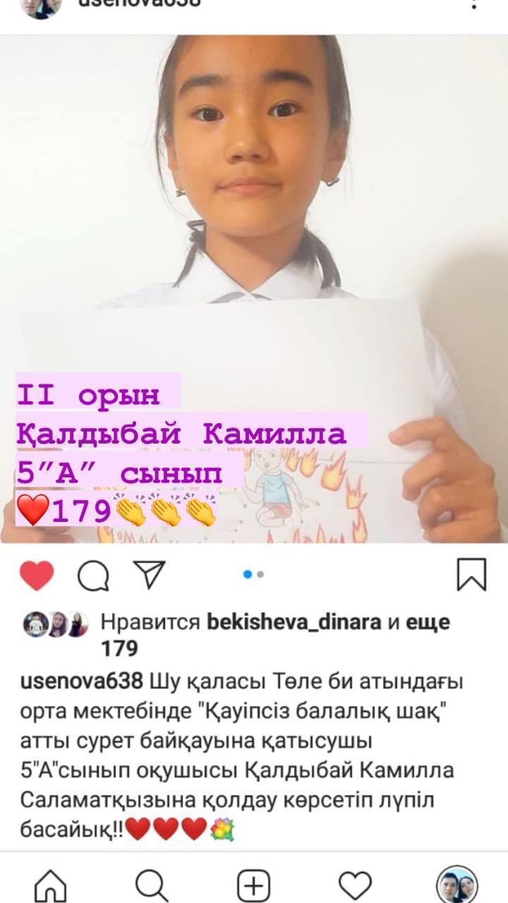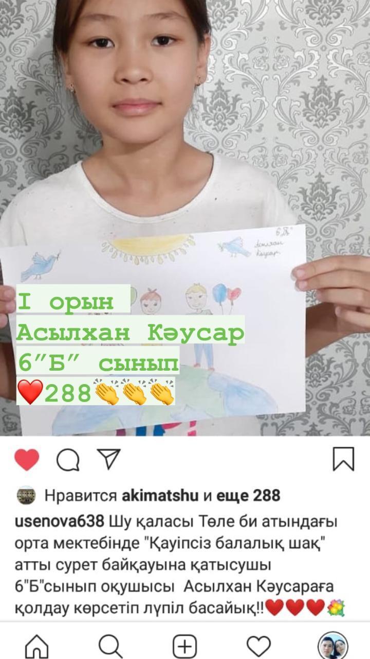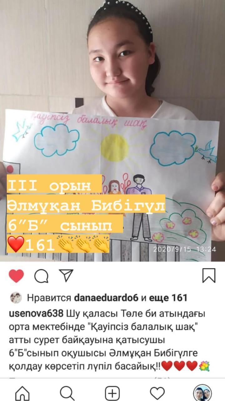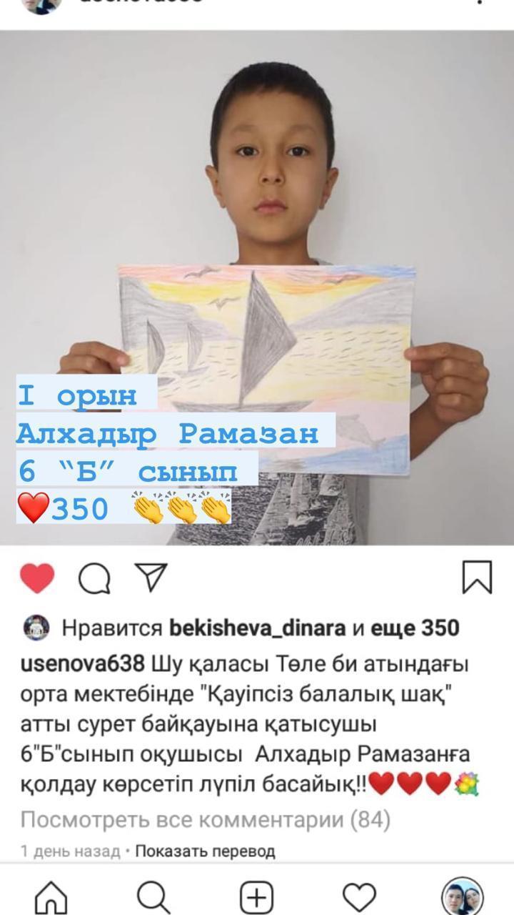 Шу қаласы, Төле би орта мектебінде "Қауіпсіз мектеп ортасы" республикалық акциясы аясында "Қауіпсіз балалық шақ" атты сурет байқауы онлайн режимінде ұйымдастырылды. І-орын 6 б сынып оқушысы Алхадыр Рамазан 350 ұпаймен, І- орын 6 б сынып оқушысы Асылхан Кәусар 288 ұпаймен, ІІ- орын 5 а сынып оқушысы Қалдыбай Камила 179 ұпаймен, ІІІ-орынды 6 б сынып оқушысы Әлмұқан Бибігүл 161 ұпаймен жеңімпаз атанды.Жеңістеріңіз құтты болсын!