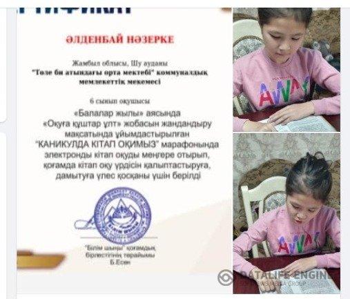 "Әрбір бала - дана бала" тақырыбында өткен күзгі каникул кезінде 6 "Б" сынып оқушысы Әлденбай Назерке "Оқуға құштар ұлт" жобасы аясында ұйымдастырылған "Каникулда кітап оқимыз" марафонына қатысты.