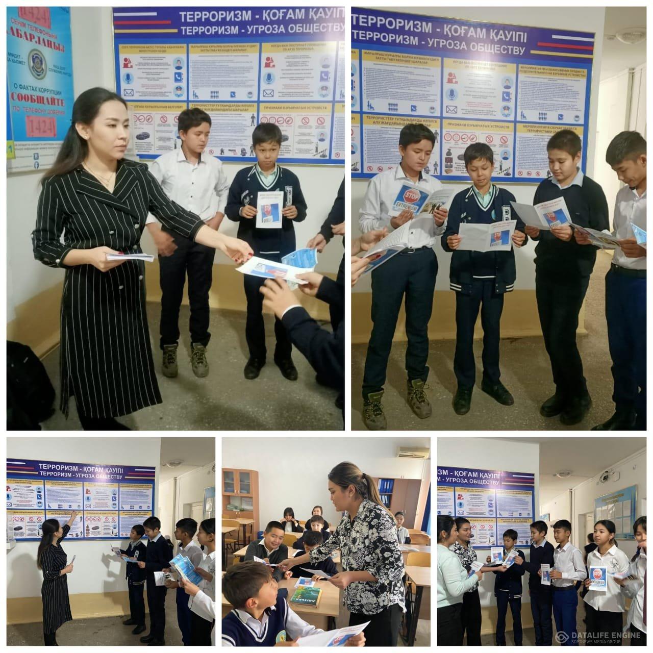 Шу қаласы Төле би атындағы орта мектебінде "Экстремизм мен терроризмге жол жоқ!" науқаны аясында "Діни экстремизм деген не?" тақырыбында 5-11 сынып оқушыларына жадынама таратылды