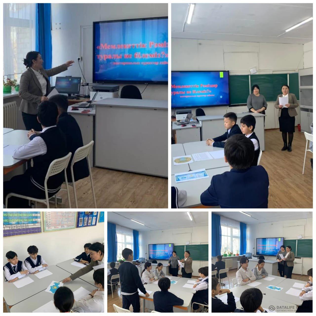 «Мемлекеттік рәміздер туралы не білеміз?» тақырыбында 7 сынып оқушыларымен викториналық сұрақтар сайысын ұйымдастырып өткізді.