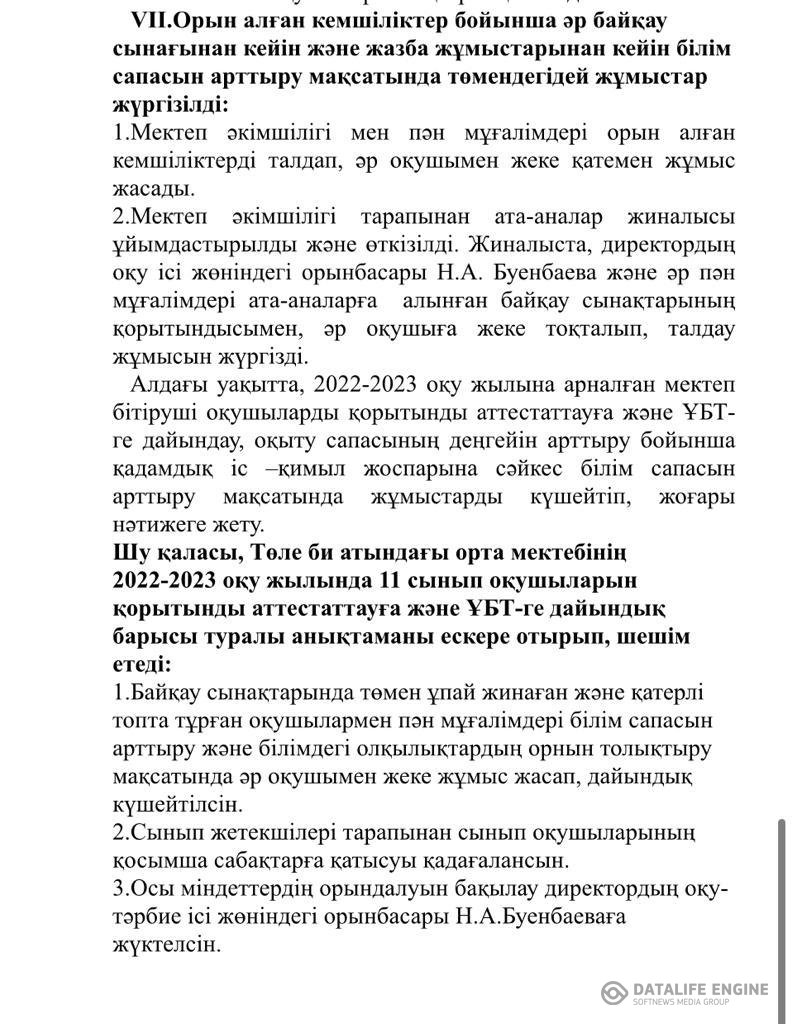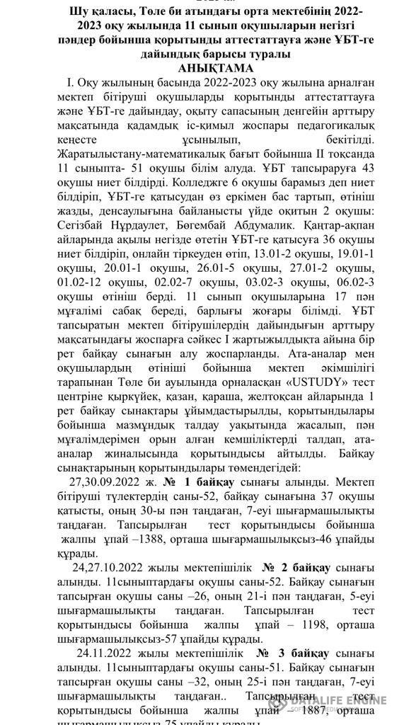 2022-2023 оқу жылында 11 сынып оқушыларын негізгі пәндер бойынша қорытынды аттестаттауға және ҰБТ-ге дайындық барысы туралы » Төле би атындағы орта мектеп