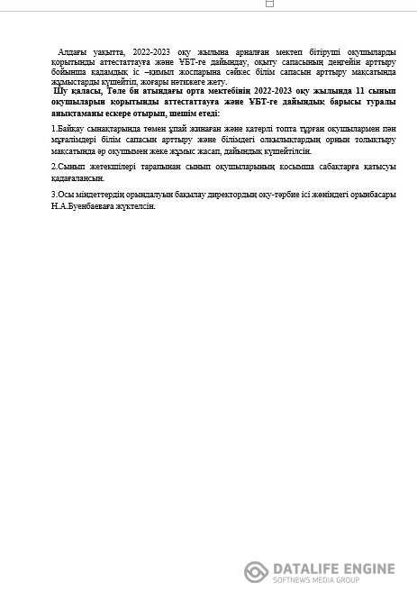 Төле би атындағы орта мектеп » Оқушыларға » ҰБТ » 2022-2023 оқу жылында 11 сынып оқушыларын негізгі пәндер бойынша қорытынды аттестаттауға және ҰБТ-ге дайындық барысы туралы