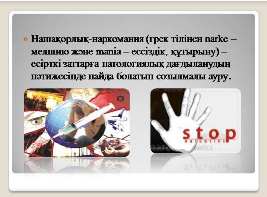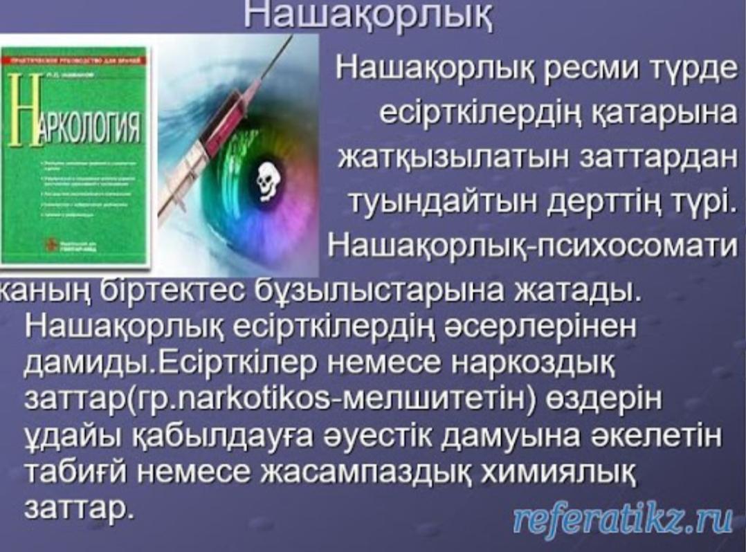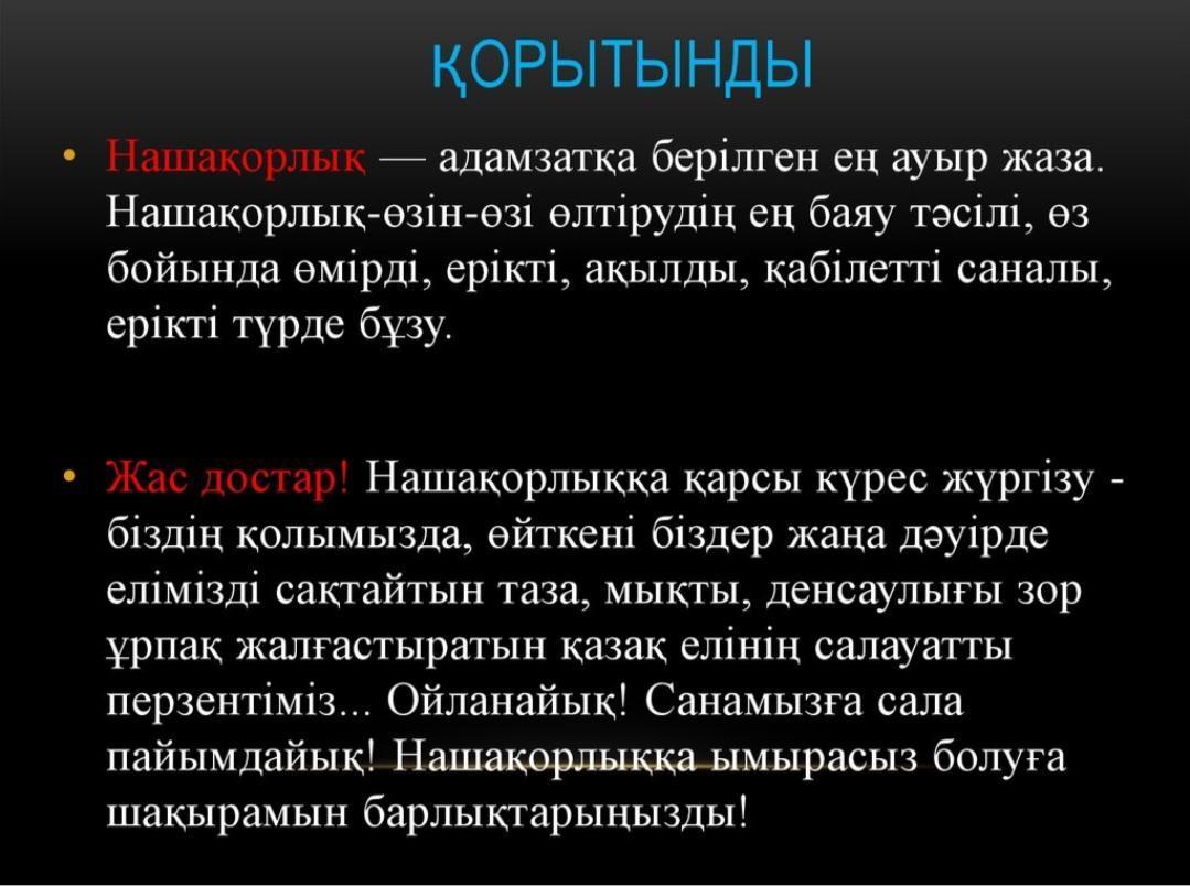 Шу қаласы, Төле би орта мектебінде кәмелеттік жасқа толмаған жасөспірімдер арасында нашақорлықтың алдын алу мақсатында " Зиянды заттардың зардабы" тақырыбында түсіндірме жұмыстары жүргізілді. Мақсаты: жасөспірімдер арасында нашақорлық туралы білімдерін кеңейтіп, ақпараттандыру деңгейін өсіру, психобелсенді заттарды, алкоголь және т.б. зиянды заттарды пайдаланбау, үнемі салауатты өмір салтын ұстануға тәрбиелеу. Ата- аналар мен оқушылар чатына түсіндірме жұмыстары жүргізіліп, ескертілді