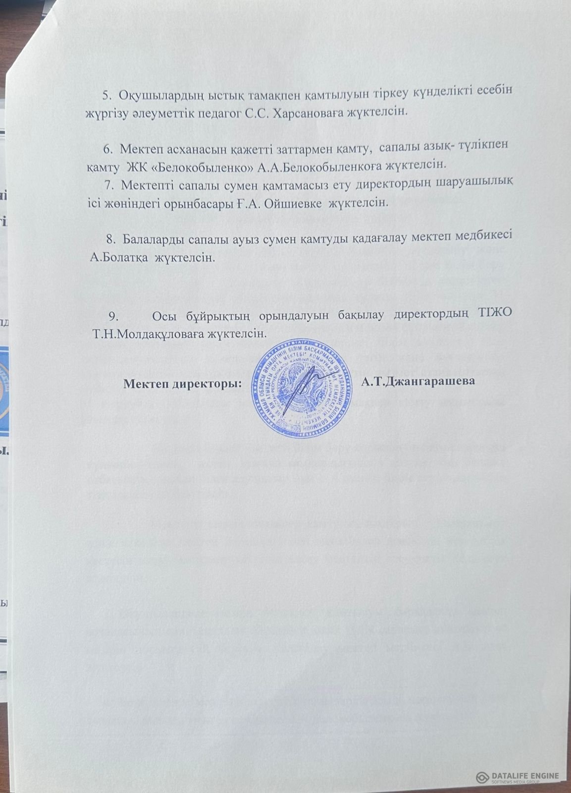 Төле би атындағы орта мектебінде ыстық тамақты ұйымдастыру туралы бұйрық