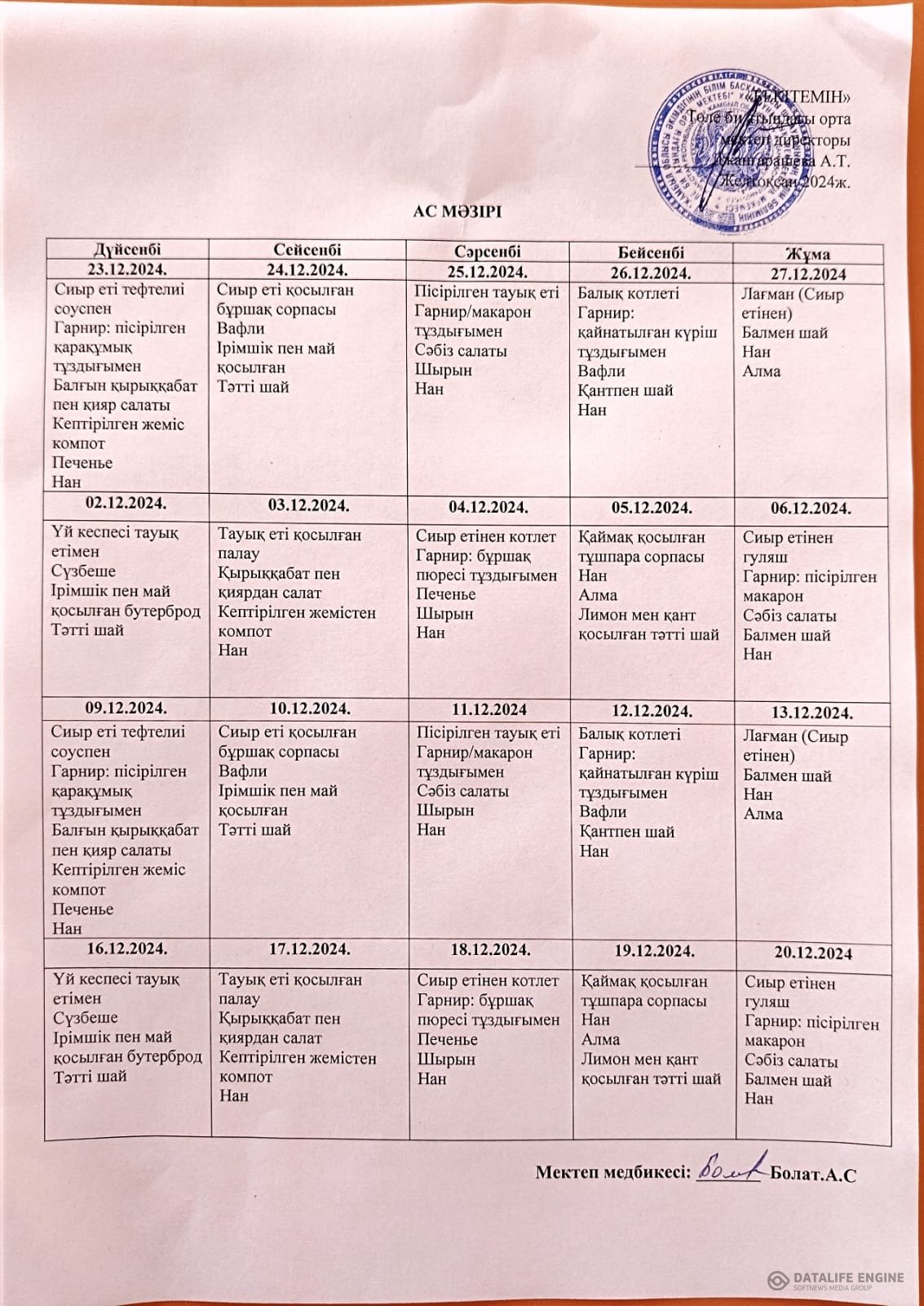 Желтоқсан айының ас мәзірі » Төле би атындағы орта мектеп