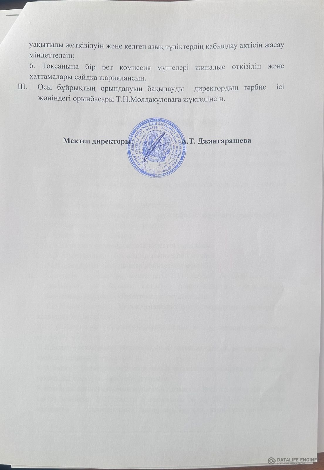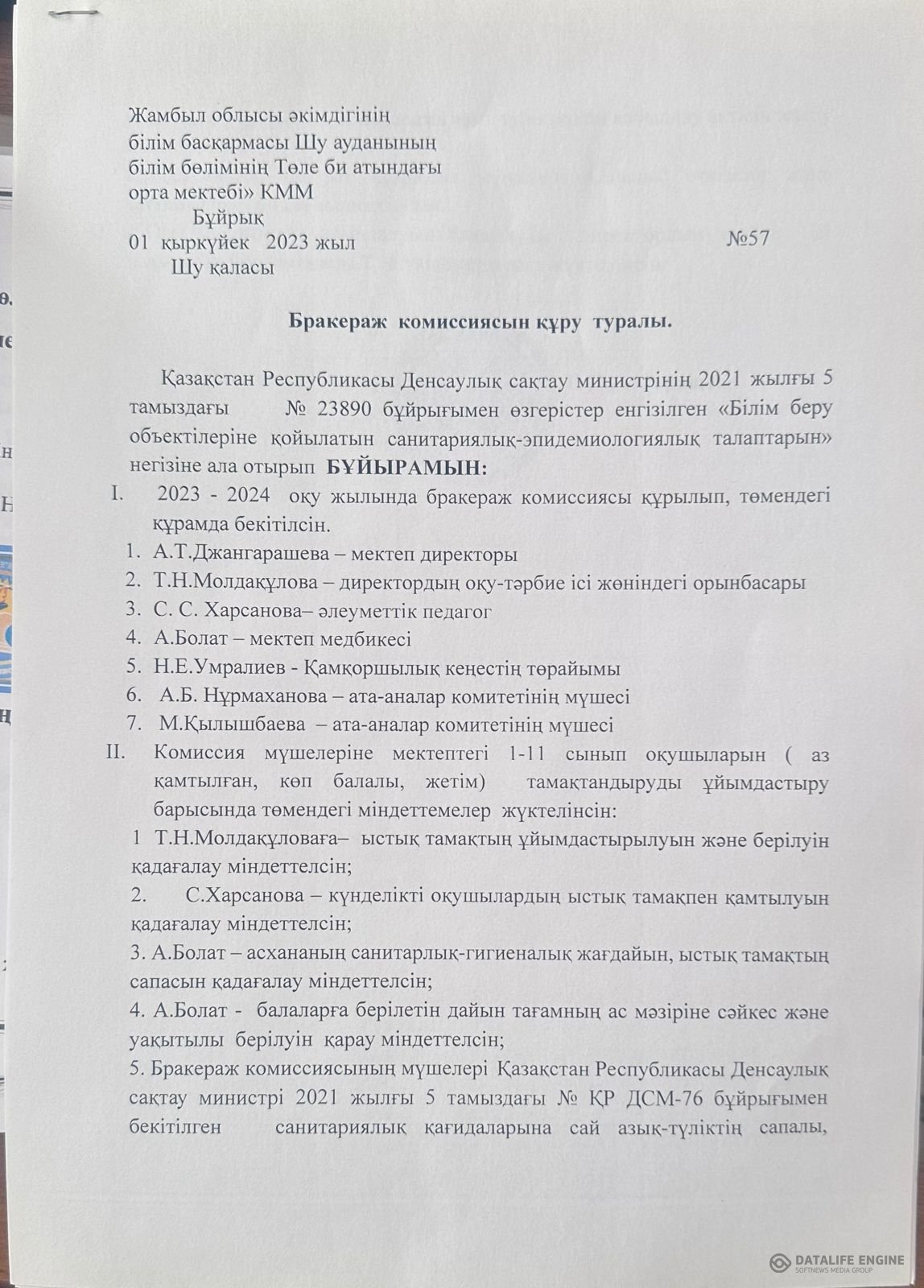 2023 - 2024 оқу жылында Бракераж комиссиясын құру жөніндегі бұйрық » Төле би атындағы орта мектеп