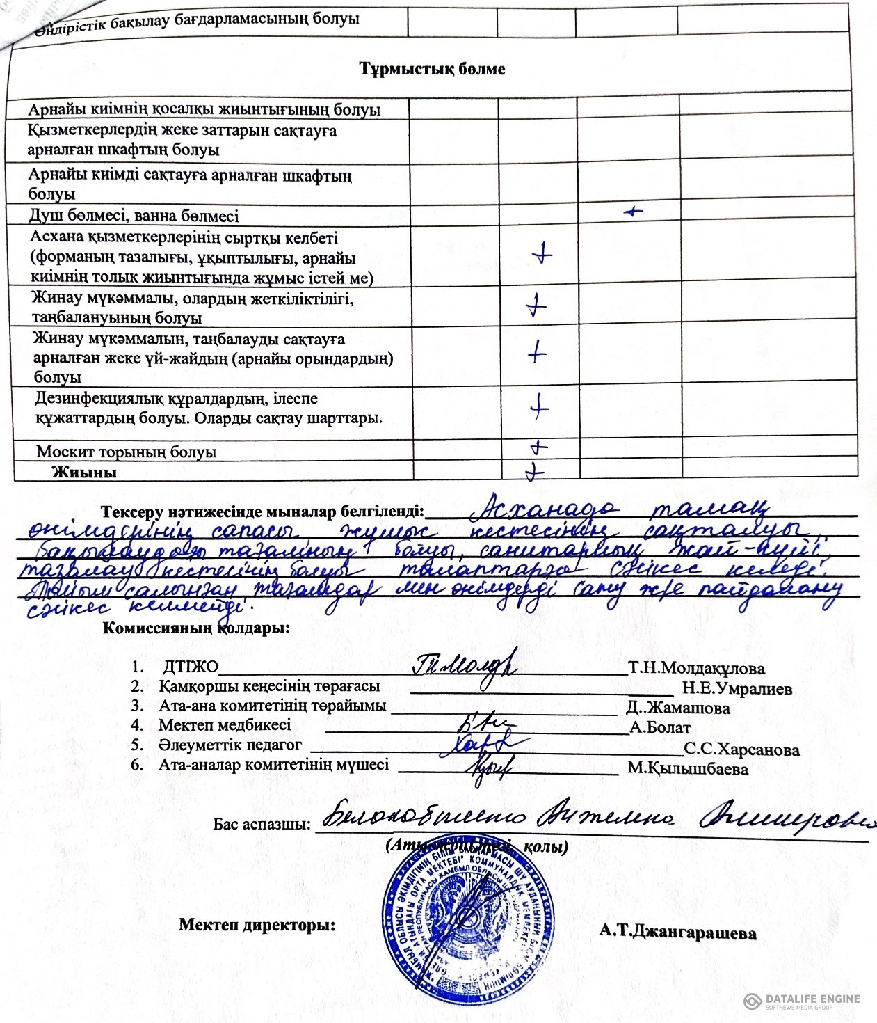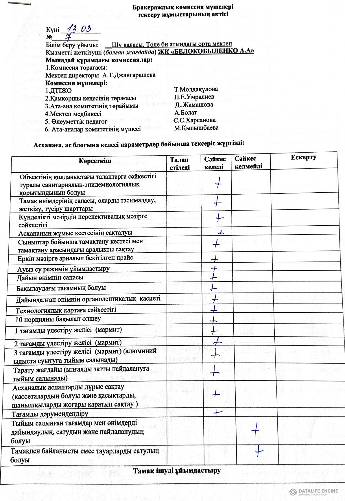 Бракераж комиссия мүшелерінің тексерісінің қорытынды актісі » Төле би атындағы орта мектеп