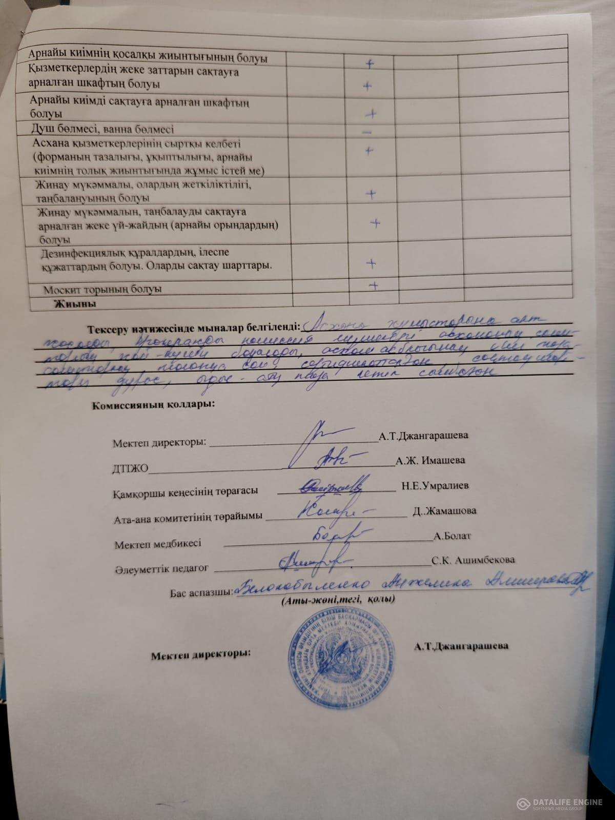 Бракеражды комиссия құрамы мектеп асханасына 2 мәрте акт жүргізіп хаттамасы толтырылады. Асхананың санитарлық жағдайы қанағаттанарлық!