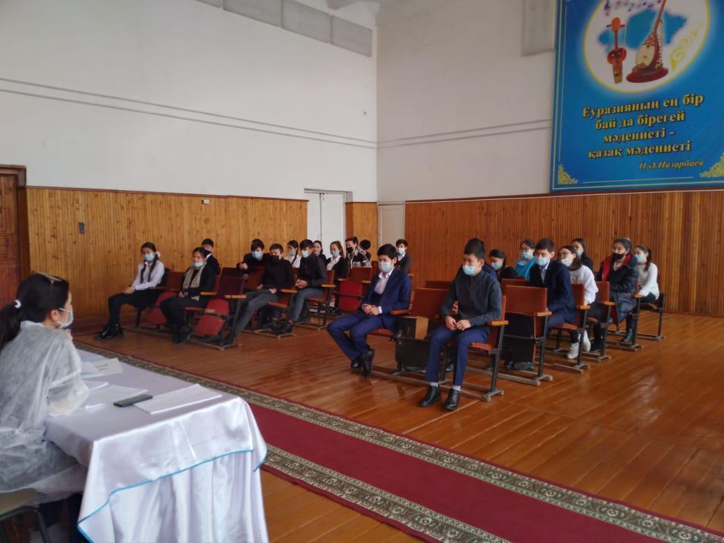 Төле би атындағы орта мектебінде 22.02.2021ж. күні қалалық емхана психологтары А.Ш.Тлепова, З.Р.Нагиоглы, М.В.Халматовамен кездесу өтті. Мақсаты: Жасөспірімдер арасында салауатты өмір салтын ұстануға тәрбиелеу, ерте жүктіліктің алдын алу. Өз ісінің шеберлері "Ерте жүктіліктің алдын алу " тақырыбында түсіндірме жұмысын жүргізіп, " Мен өмірді сүйемін"