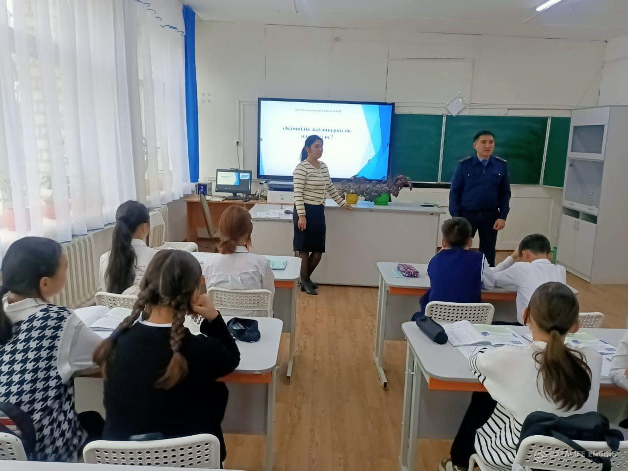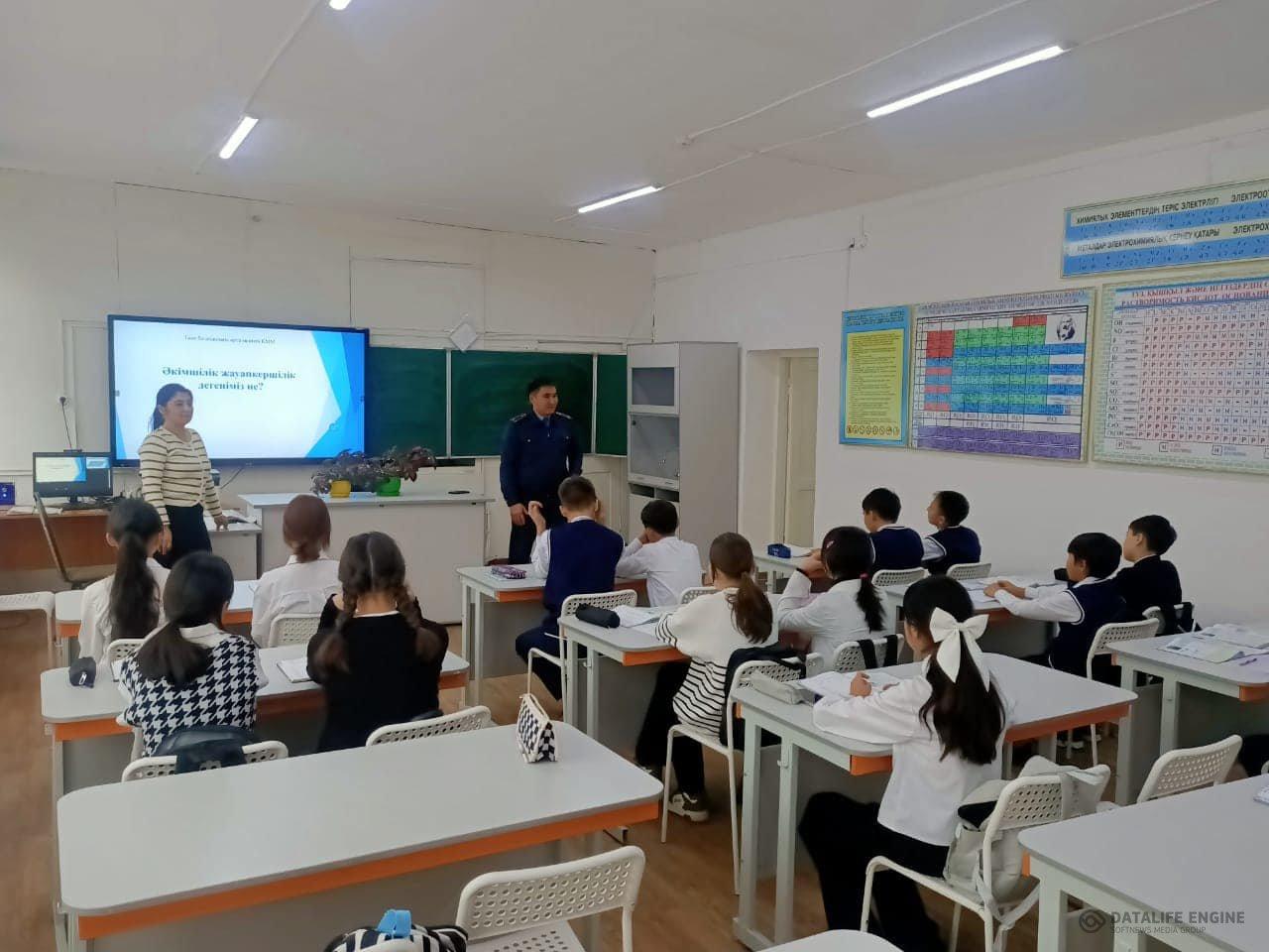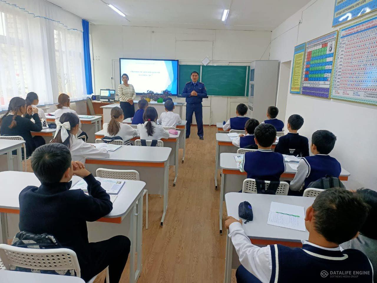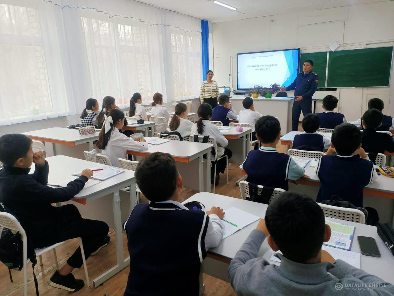 Төле би атындағы орта мектебінде Шу АПБ-нің ЖІІҚ-нің ювеналдық бөлімшесінің инспекторы,полиция лейтенанты «Администрация жауапкершілік деген не?» тақырыбында түсіндірме жұмыстарын жүргізді.