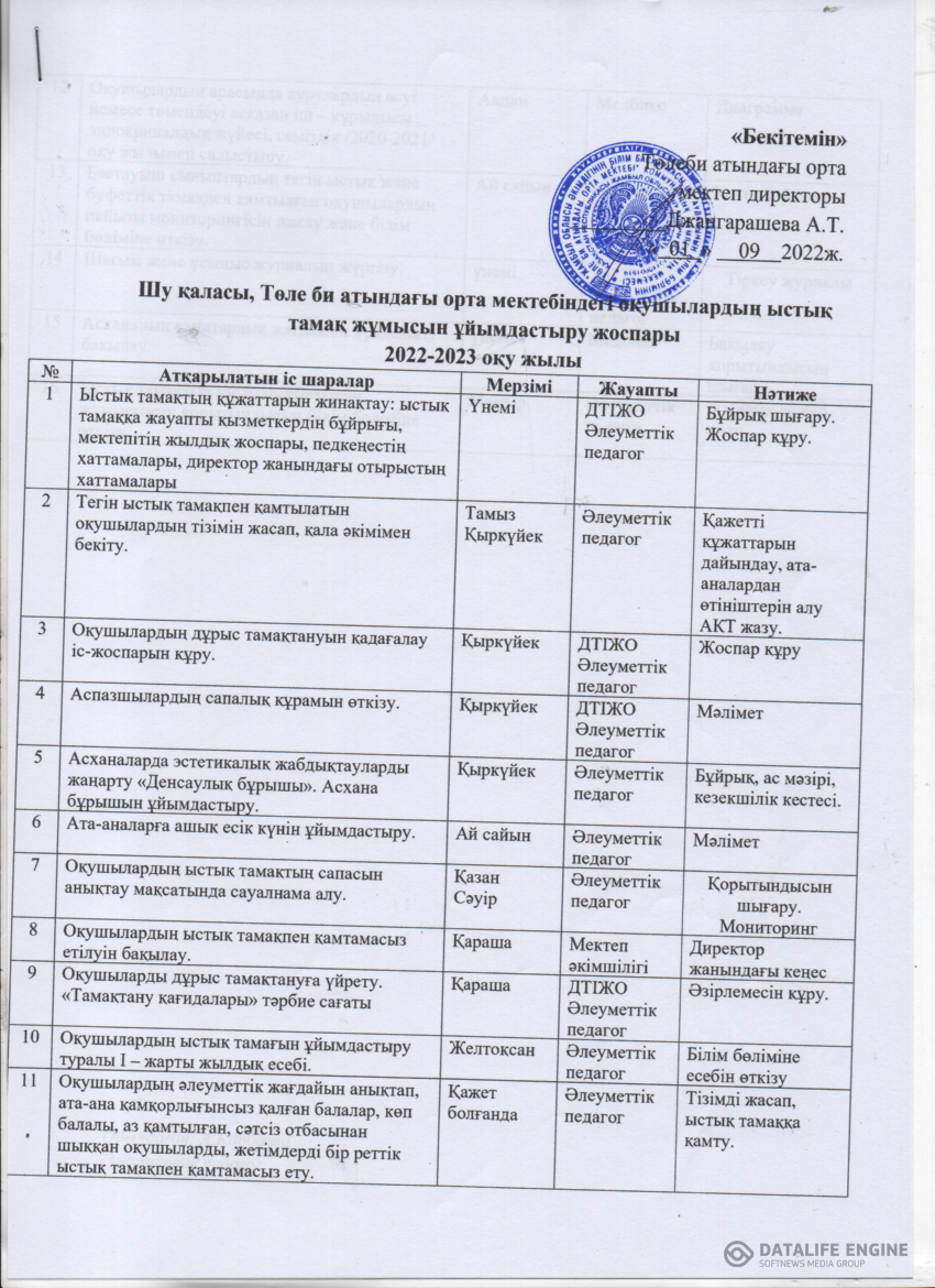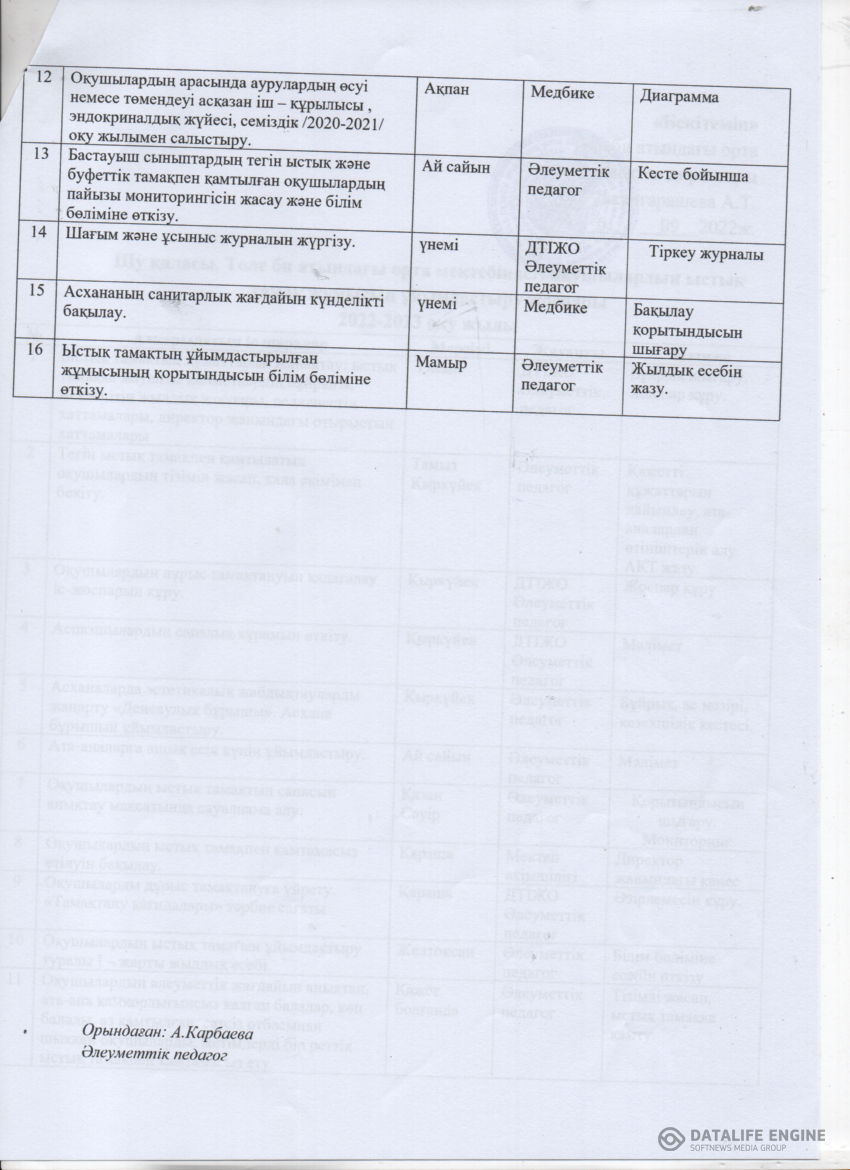 Оқушылардың тамақтандыру жұмысын ұйымдастыру жоспары » Төле биСредняя школа имени